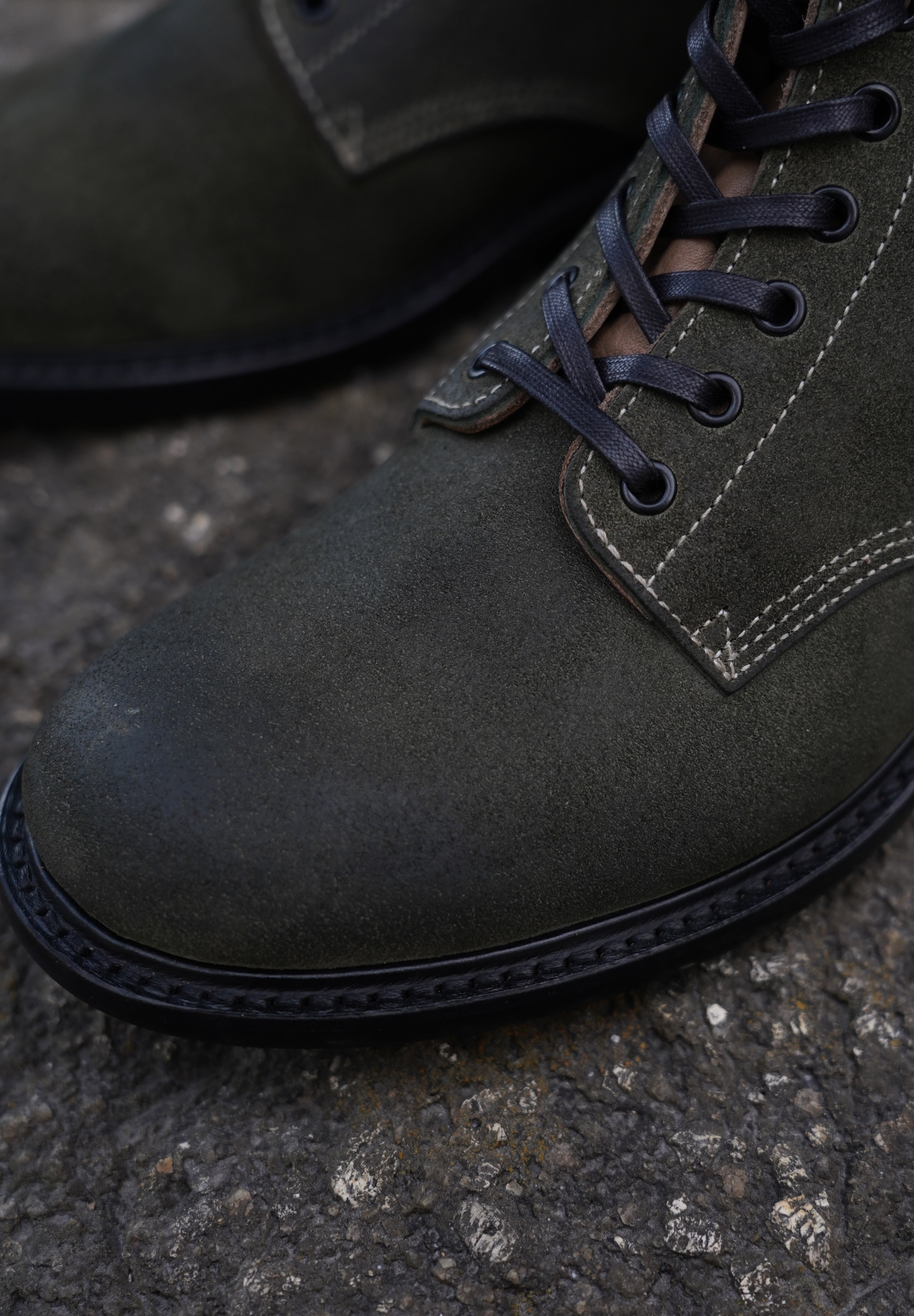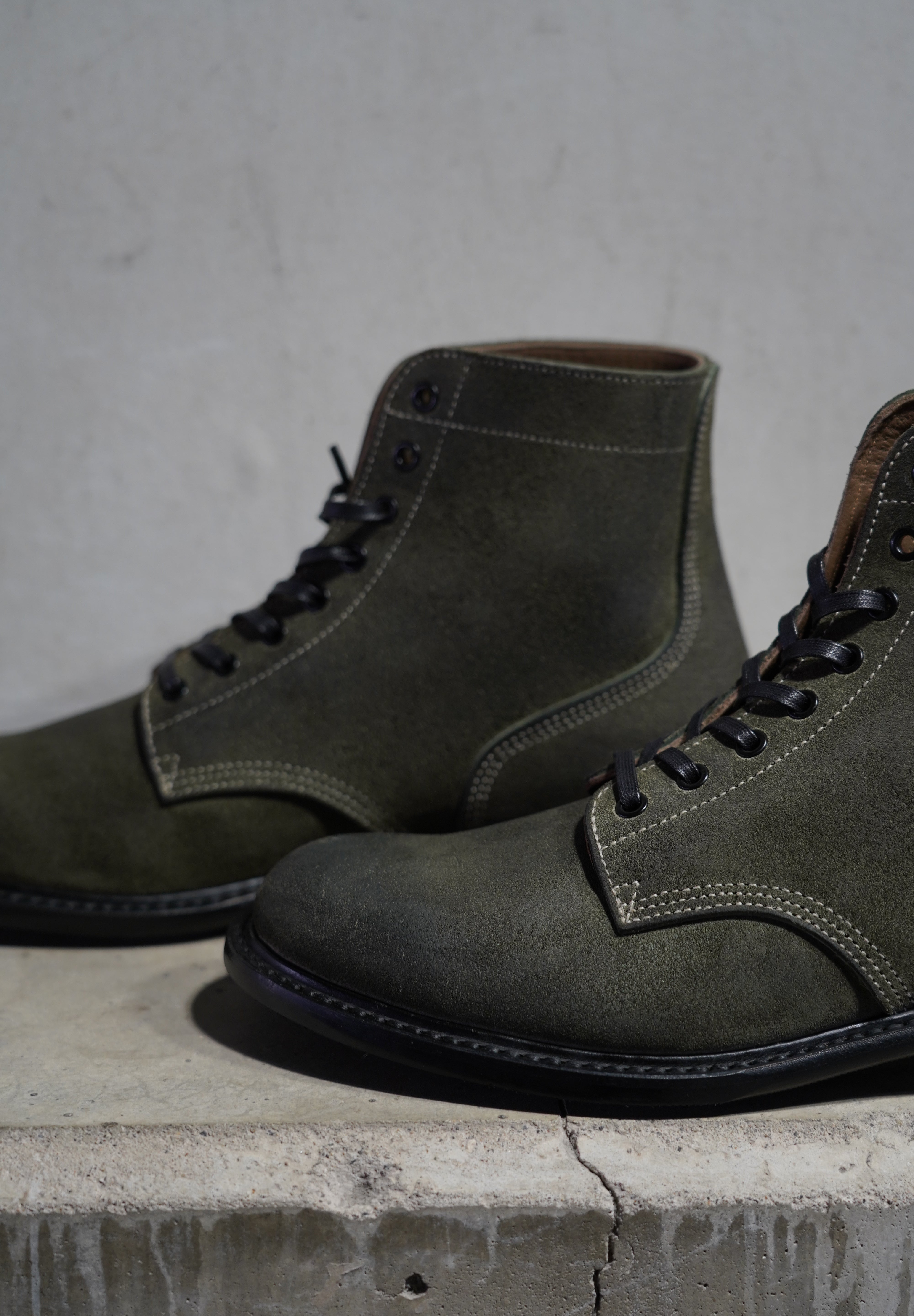 ワックスは使い込むごとに馴染み、部分的に取れたり深みを増すことで、独自のエイジングが楽しめます。特に、履きジワや摩耗による色ムラが美しい表情を作り出し、他のスエードでは見られない変化を楽しめます。