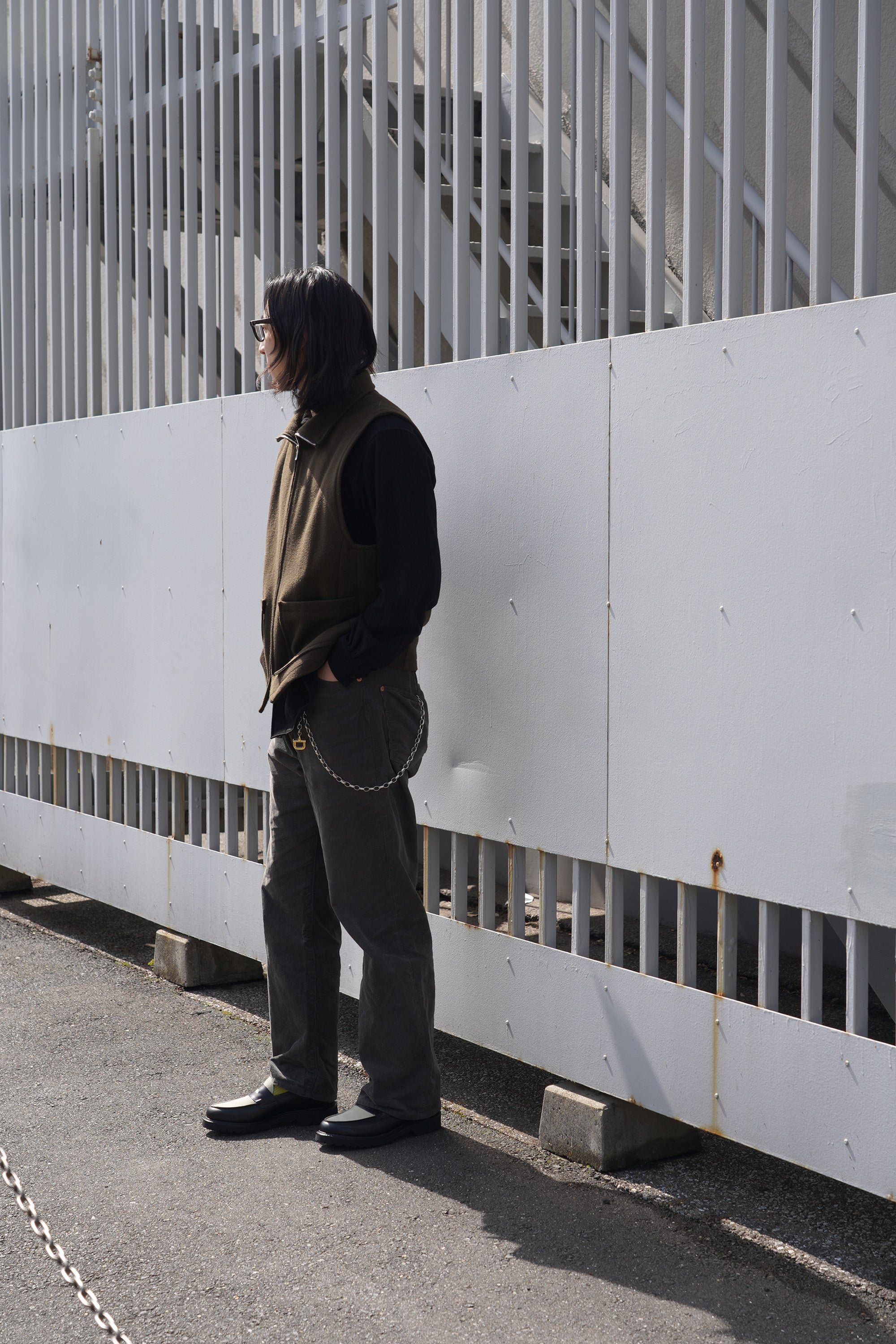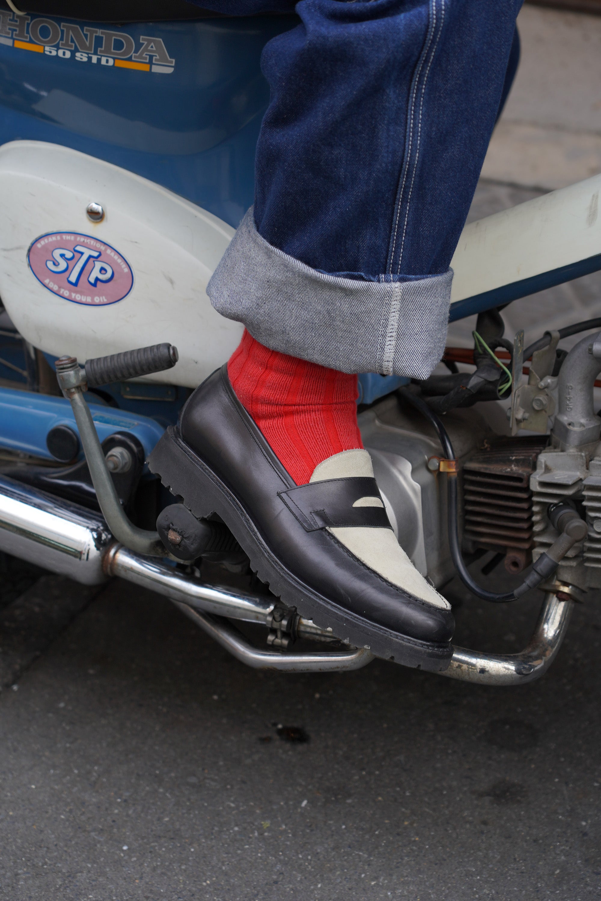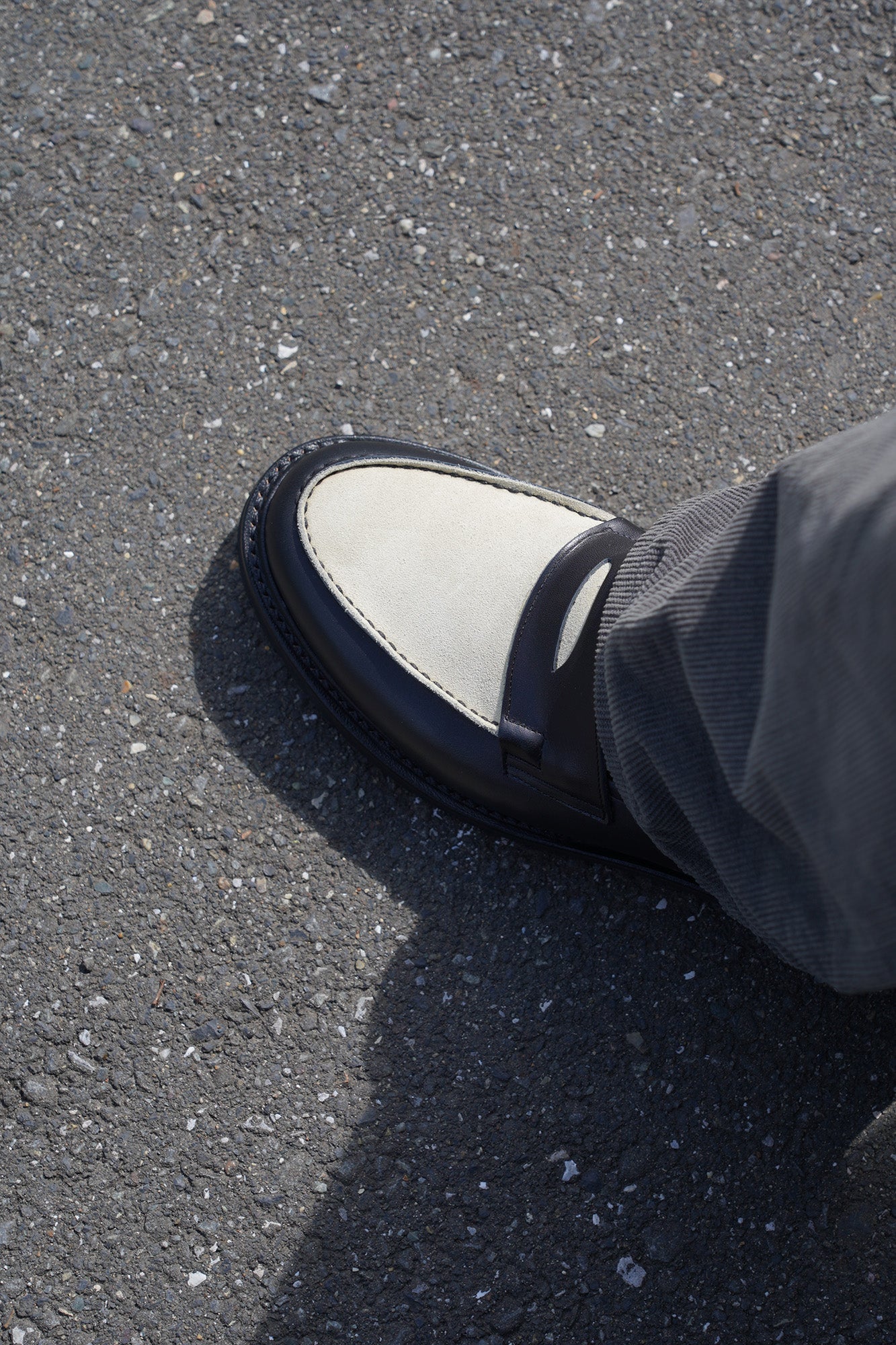 市場に良くあるガラスレザーではなくスエードとの配色にする事で落ち着いた印象になり、スラックスからデニムまで様々なスタイルのパンツに良く合います。