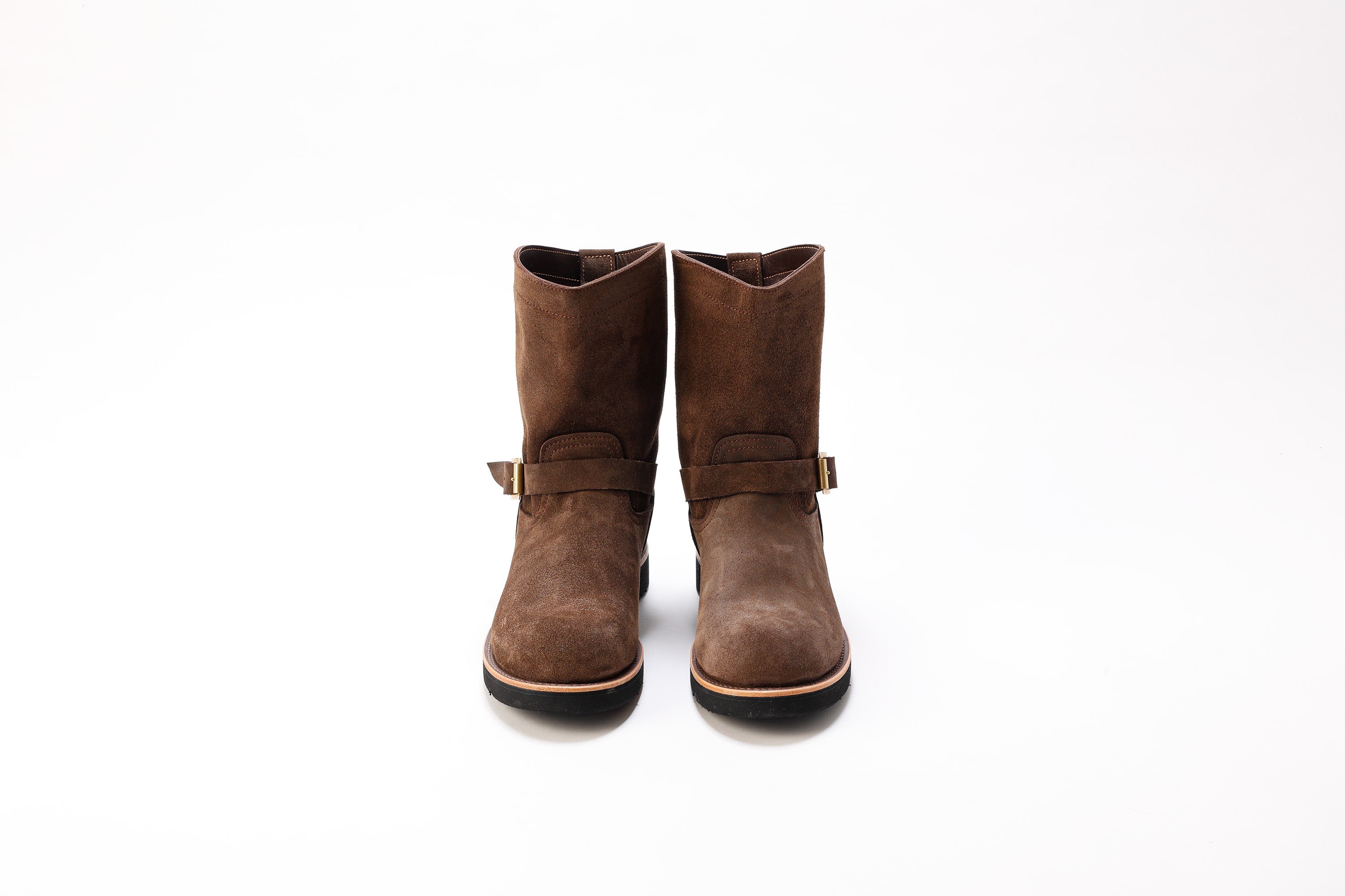 歩行性を高める為フラットソールを組み合わせました。履き口部は無駄を削ぎ落とし、ローパーブーツに似たカッティングでシンプルに落とし込みました。