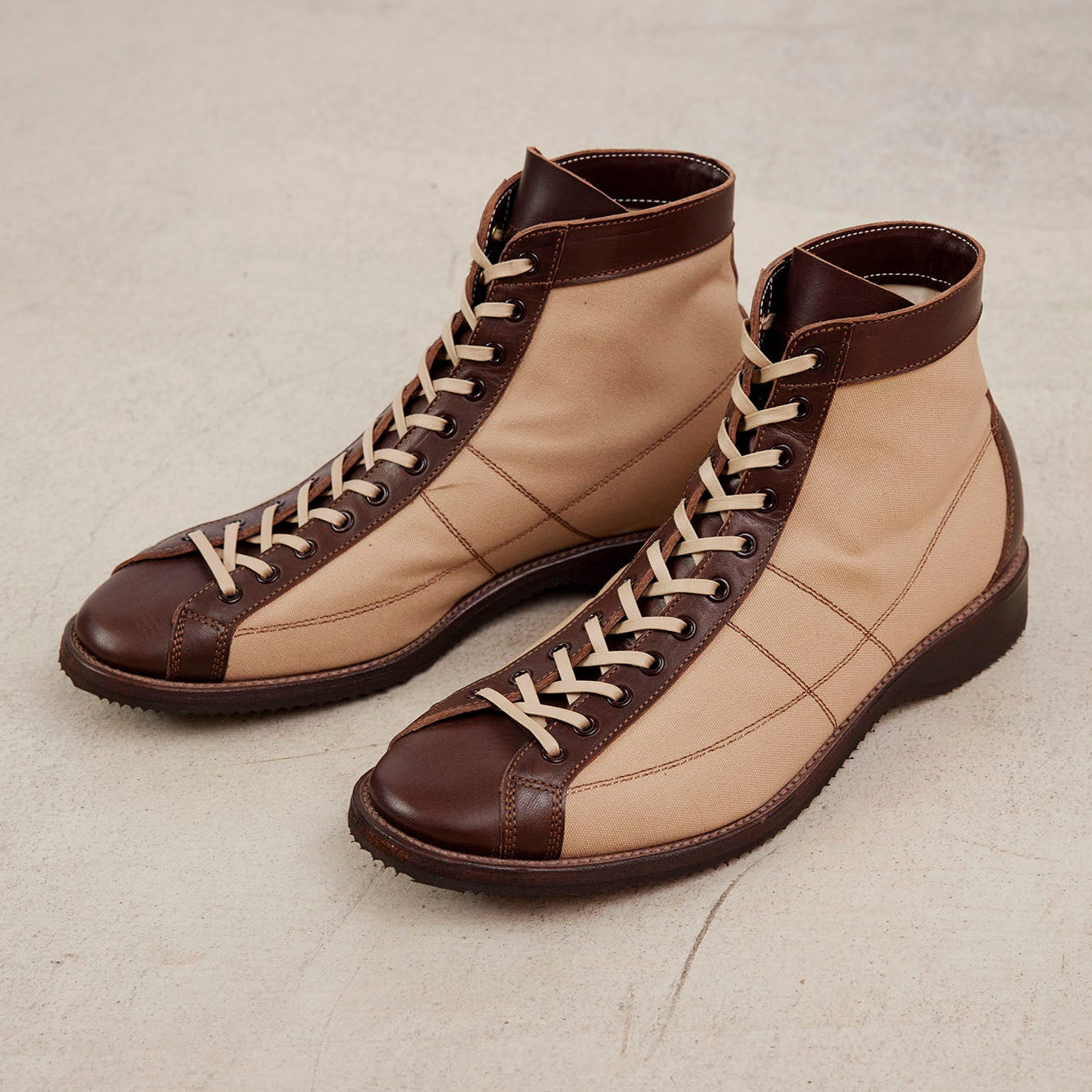 しっかりと打ち込まれた上質な帆布とバケッタ鞣しのベジタブルタンニンレザーの組み合わせは、クタクタになるまで履き込みたくなる1足です。