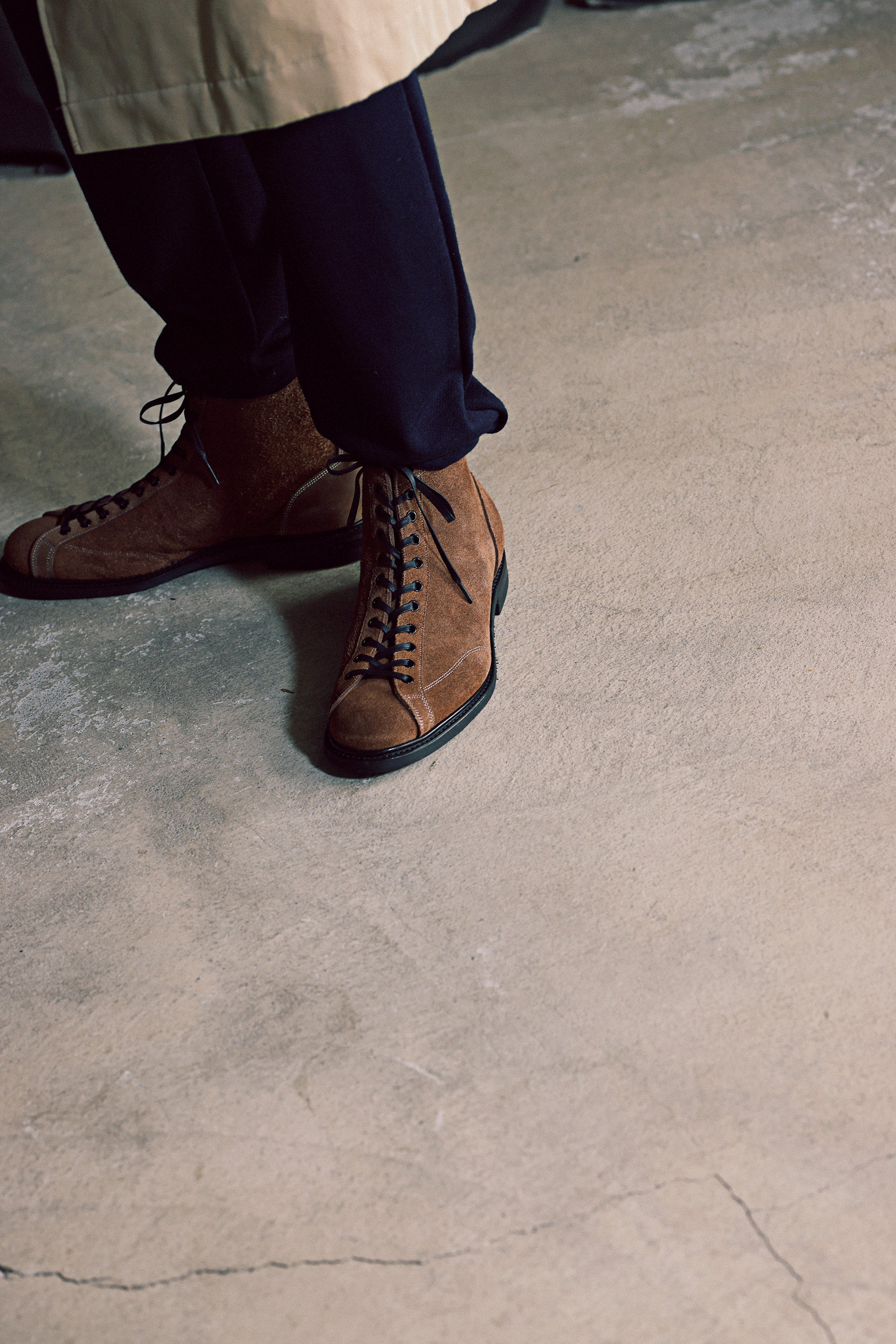 1920年代から40年代のトレーニングシューズをデザインソースにグッドイヤー製法で作り込みました。昔のスポーツシューズはキャンバス製が多くみられますが、耐久性を求められたスポーツには革製も存在していました。これを私達はアスレチックブーツと呼んでいます。レースホールも多いデザインなのでパンツから見えるシルエットは美しく足元を引き締めます。