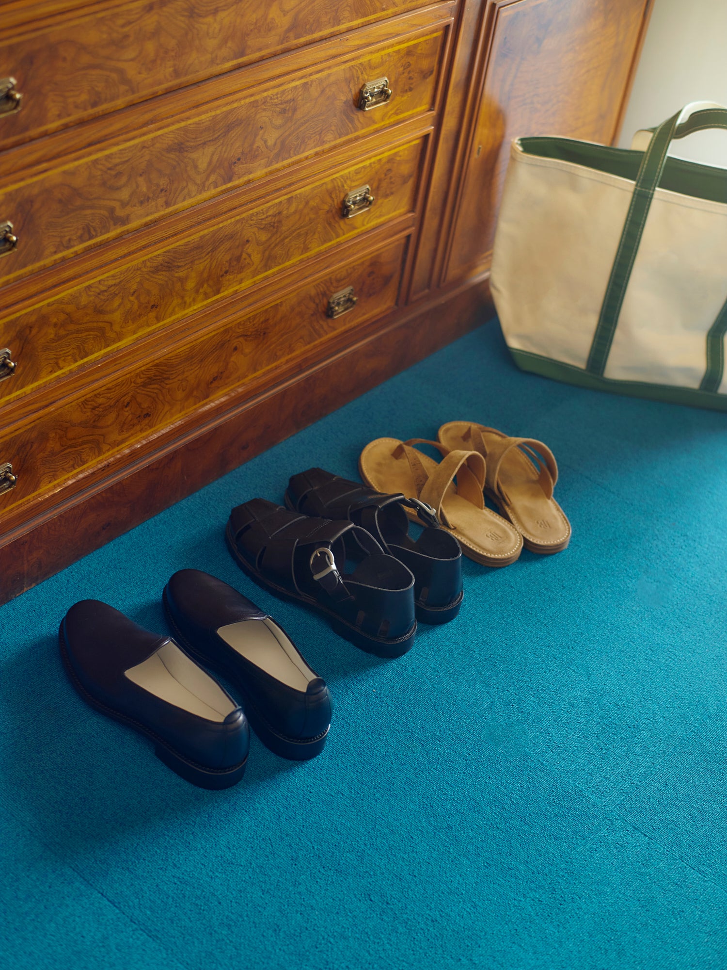 中東の民族靴からインスピレーションを受け、フランス軍などで履かれていたルームシューズのデザインをミックスさせた一足です。