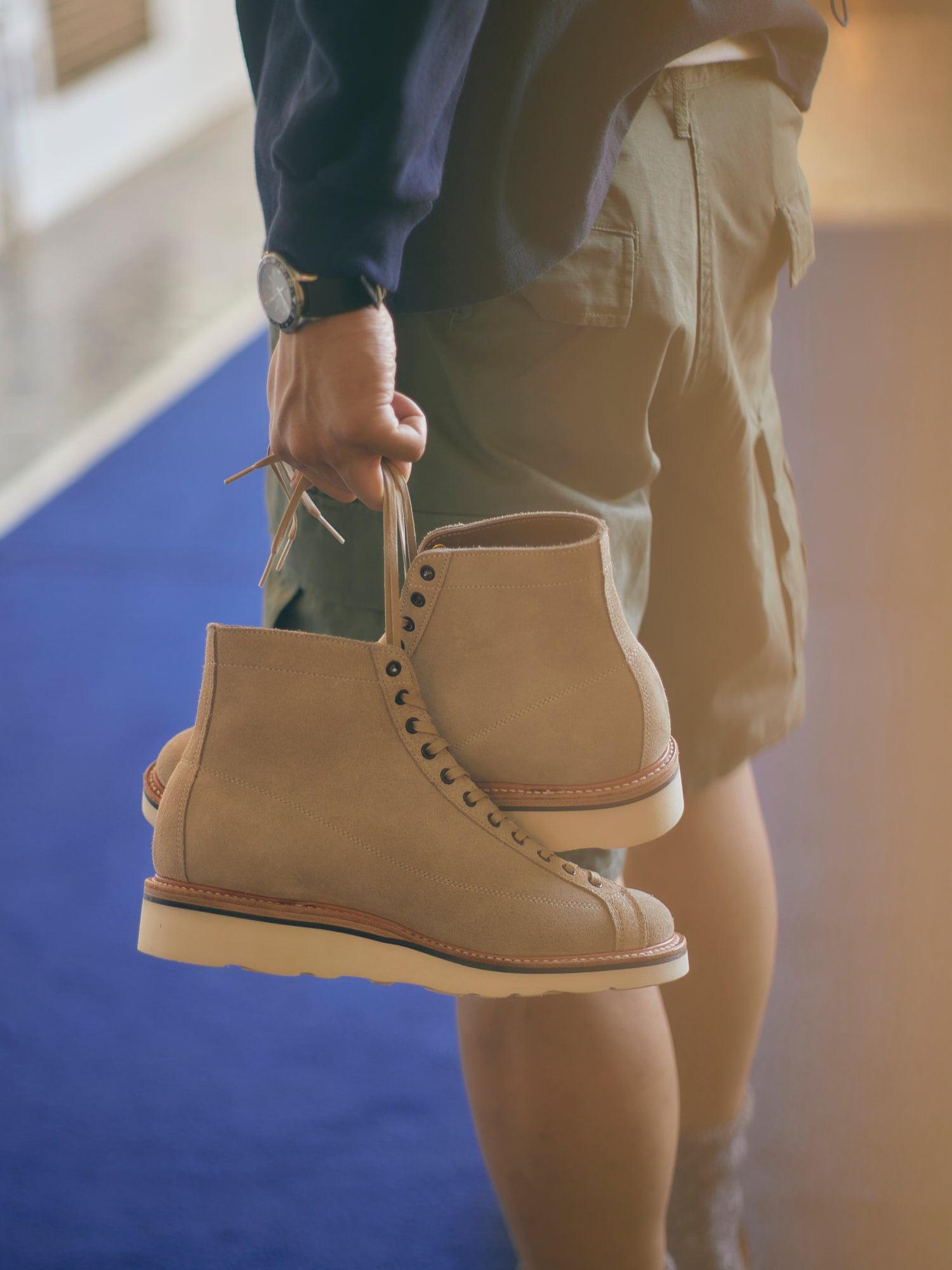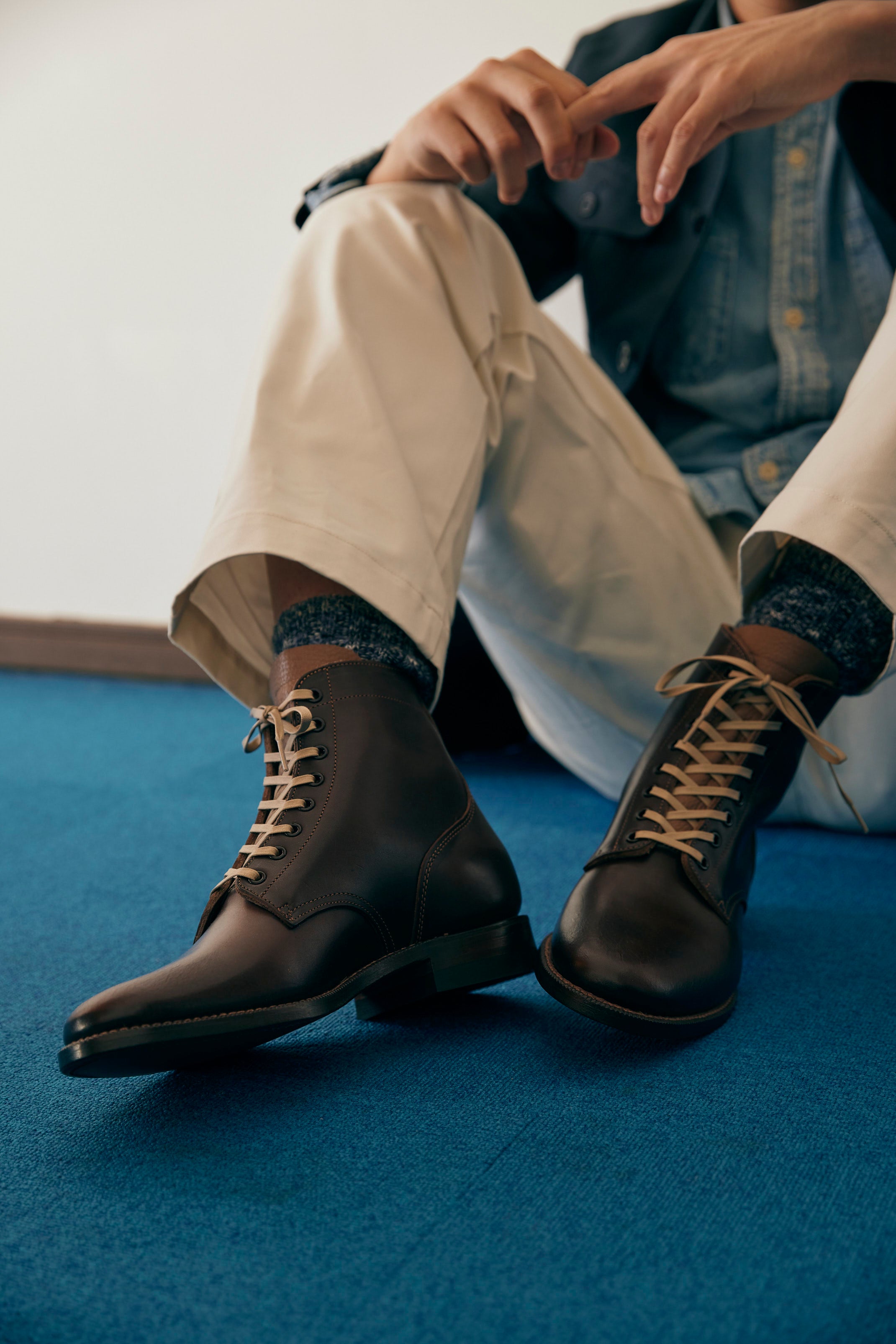 USミリタリーのM43をベースにした伝統的なブーツのデザインです。BROTHER BRIDGE でもアップデートを繰り返しながらリリースしてきました。厚く、硬い革を使ったブーツがこのデザインの本来の形でしたが、私達は比較的柔らかいカーフや銀付スエードなどを用い作り込んできました。